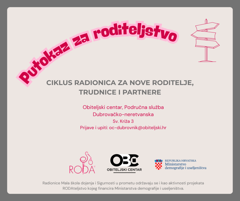 Obiteljski centar Područna služba dubrovačko neretvanska u partnerstvu s udrugom Roda provodi ciklus radionica za nove roditelje, trudnice i partnere PUTOKAZ ZA RODITELJSTVO.