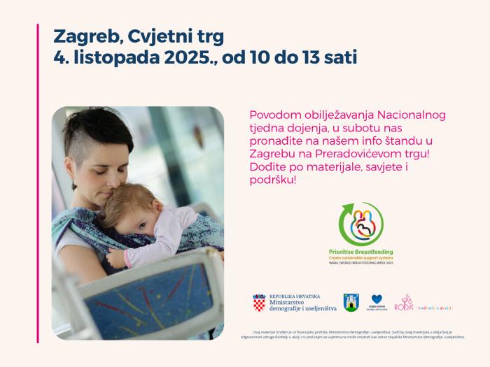 Grad Zagreb, Gradski ured za socijalnu zaštitu, zdravstvo, branitelje i osobe s invaliditetom, domovi zdravlja kojima je osnivač Grad Zagreb, udruga Roditelji u akciji – RODA te Banka humanog mlijeka KBC-a Zagreb i ove godine zajednički organiziraju javnozdravstvenu akciju podrške dojenju. Na štandu će trudnice i roditelji moći saznati više o važnosti dojenja, dobiti letke i brošure o pripremi za dojenje, kao i stručne savjete o podršci dostupnoj u lokalnoj zajednici.
