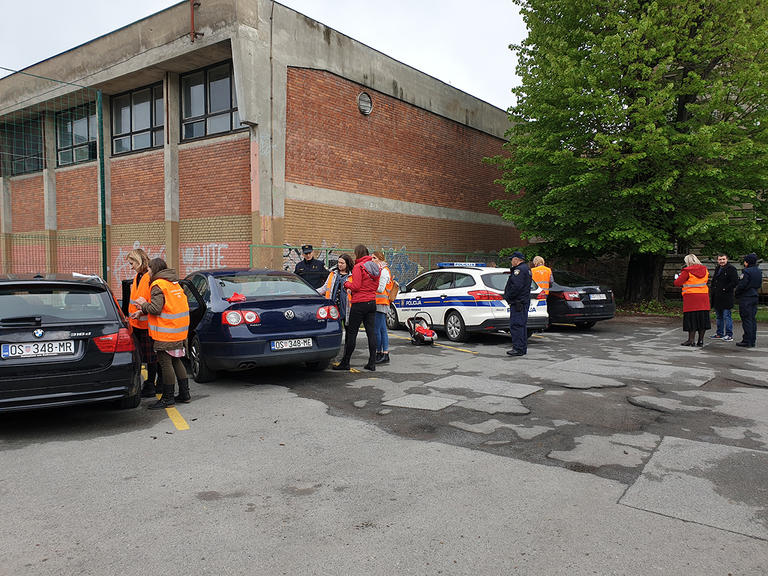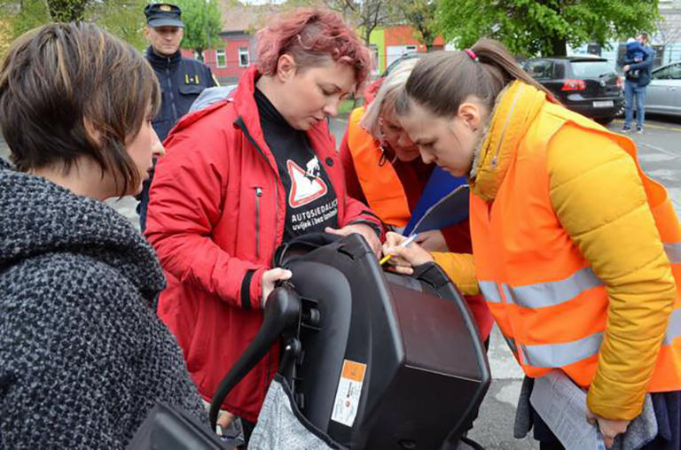 Nakon savladavanja ispitnog materijala i pokaznih vježbi, za novopečene savjetnice uslijedio je i test s roditeljima na besplatnom pregledu autosjedalica. Pregled je održan na dvorišnom parkiralištu Filozofskog fakulteta koji se kao ograđeni prostor u centru grada pokazao idealnim. Kako su u Osijeku mogle biti prisutne samo dvije iskusne savjetnice, radilo se ekipno s 2 automobila istodobno te je pregledano 16 autosjedalica. Novooformljeni tim dobro će doći i slavonskim roditeljima jer je kod 12 autosjedalica utvrđeno da se radi o nepravilnom korištenju autosjedalice ili nepravilnom vezanju djeteta, a za jednu autosjedalicu se pokazalo da je prestara odnosno da joj je rok uporabe prošao, tako da se zabrinuta majka odmah uputila u nabavku prikladnije autosjedalice.
