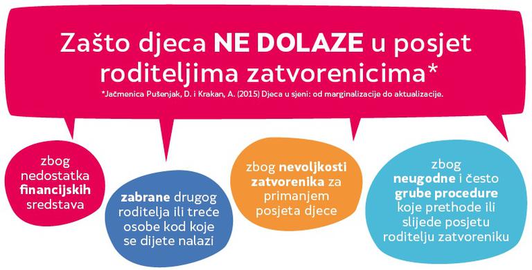 Iako svi zatvori u Hrvatskoj imaju kutić za djecu u prostorima za posjete oni često ne odgovaraju potrebama djece. Često nisu ugodni za boravak, oskudno su opremljeni s derutnim namještajem, neprilagođenim djeci ili zajedničkoj aktivnosti djeteta i roditelja, s potrganim igračkama koje nisu obnavljane nakon prvog uvođenja niti se vodi računa o djeci različitih dobi.