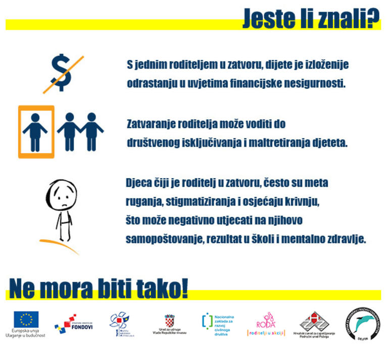 Svako dijete treba roditelje, ali nemaju sva djeca jednaku mogućnost odrastati uz roditelje. Gotovo jedan milijun europske djece odrasta s jednim roditeljem u zatvoru. U Hrvatskoj nije poznat točan broj djece čiji su roditelji lišeni slobode, a prema procjenama Ureda pravobraniteljice za djecu godišnje čak oko 18.000 djece u nekom trenutku ima jednog ili oboje roditelja u zatvoru. Iako ne izdržavaju kaznu, zatvor postaje životno okruženje ove djece ukoliko žele vidjeti svoje roditelje.