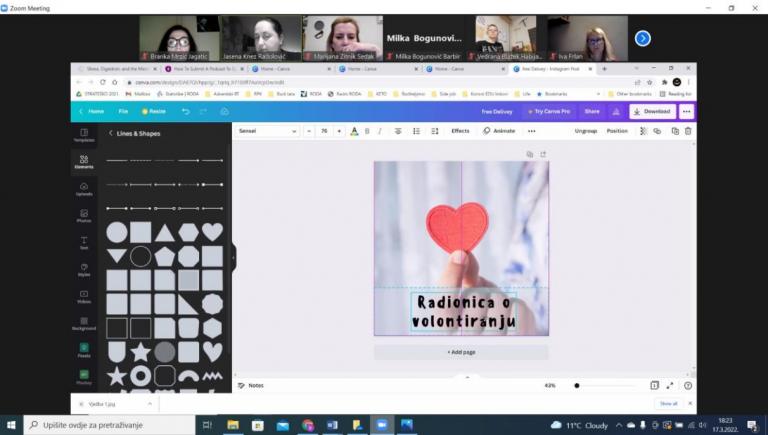 Nakon upoznavanja s okruženjem Canve, polaznice su imale priliku kroz niz praktičnih vježbi isprobati korištenje pojedinih elemenata za izradu vizuala, upotrebljavajući brojne gotove predloške, a zatim su naučile i mijenjati elemente na postojećim predlošcima, kao i kreirati vlastite predloške. Upoznavanjem Canve, polaznice su planirale i na koji način će je odmah iskoristiti za kreiranje vizuala u projektima i programima u kojima su aktivne.