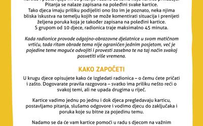 Razgovor o pojedinoj temi započne se tako da se djeci pokaže slika (edukativna kartica), ispriča neka (osobna) zgoda na zadanu temu i postavljaju pitanja vezana uz temu koju kartica prikazuje. Djeca u razgovoru imaju priliku podijeliti ono što im je poznato, neka njima bliska iskustva na temelju kojih se može komentirati situacija, a na kraju zajedno dolazimo do željene poruke ili zaključka (zapisano na poleđini kartice).