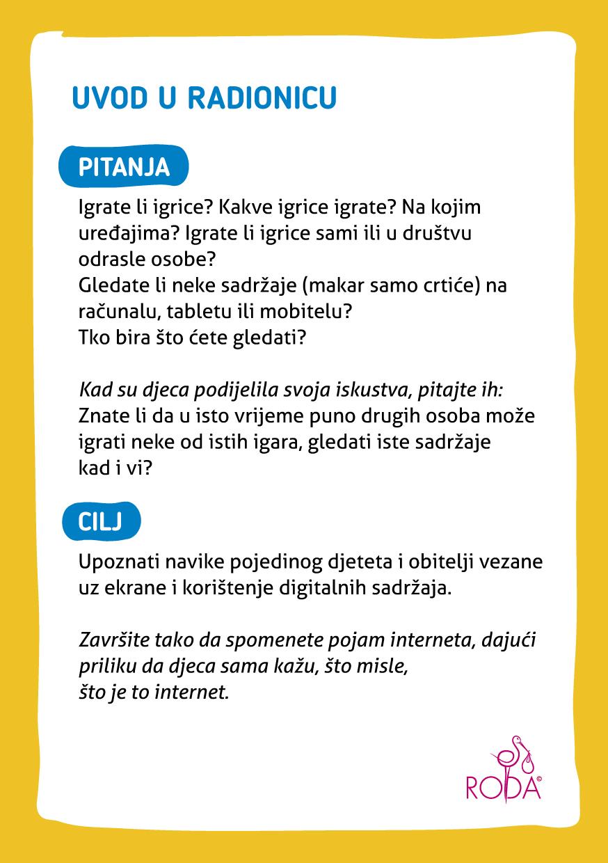 Kartice prate teme koje se obrađuju na radionicama s djecom (više o radionicama s djecom možete pročitati u Metodološkom priručniku za provođenje radionica o digitalnoj pismenosti djece, Digitalna pismenost od vrtića), a koje ujedno predstavljuju temelj znanja nužnih za sigiurno i odgovorno korištenje digitalnih uređaja i sadržaja.