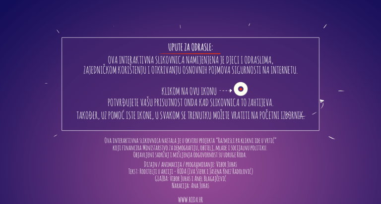Kako bismo pomogle roditeljima približiti djeci osnovne koncepte sigurnog korištenja interneta (na razini predškolske dobi i u skladu s opasnostima koje su realne za njihovu dob i način korištenja interneta), u okviru projekta Razmisli pa klikni ide u vrtić kreirana je interaktivna slikovnica u kojoj obrađujemo teme relevantne za predškolsku dob.
